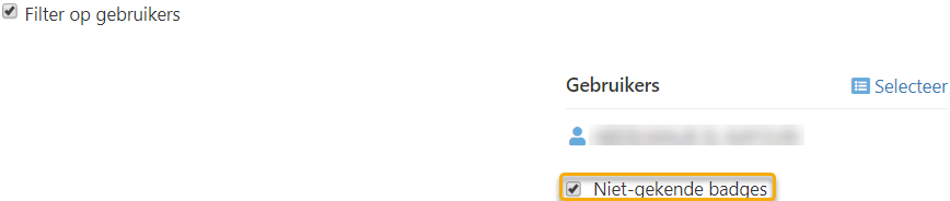 Klik op de knop Selecteer, rechts van Gebruikers, en selecteer de gewenste gebruikers (zie hiervoor Hoe resources selecteren en filteren?). Dit is eigenlijk de selectie van de met deze gebruiker gekoppelde badge.