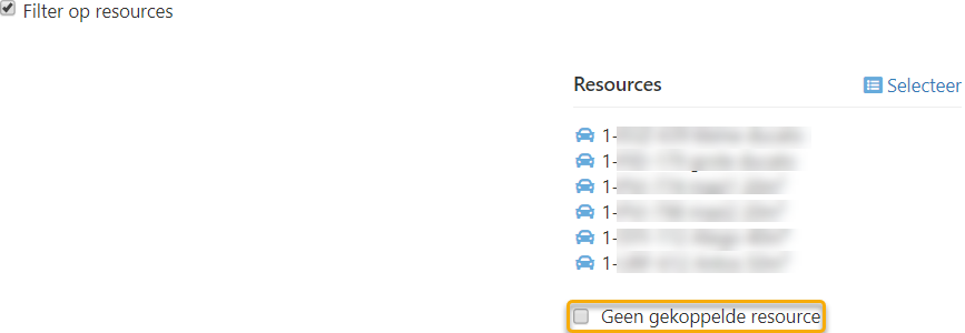 Klik op de knop Selecteer, rechts van Resources, en selecteer de gewenste resources (voertuigen, prikklokken, ...) (zie hiervoor het artikel Hoe resources selecteren en filteren?).