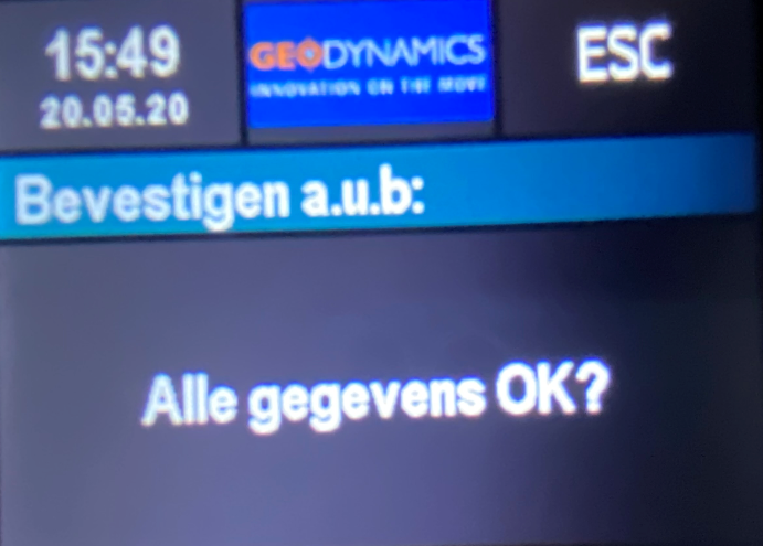 Als dit correct is gebeurd, wordt via de melding "Alle gegevens OK" gevraagd finaal te bevestigen. Bevestig door op de deze zone te drukken zodat de melding "Data opslag gelukt" verschijnt.