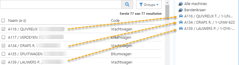 Groepen In de resultatenlijst verschijnen de voertuigengroepen. Tussen haakjes wordt aangegeven hoeveel voertuigen zich in deze groep bevinden. Selecteer alle voertuigen binnen een voertuiggroep via een klik in het aanvinkvakje links van de groepsnaam. In het rechtse vak verschijnt de groepsnaam. ![]() Door de groep Alle voertuigen te selecteren, maak je onmiddellijk de selectie van het volledige wagenpark. Dit is een groep die automatisch wordt aangemaakt, en dus steeds beschikbaar is. De groep Alle groepen is een groep die wordt aangemaakt indien je de voertuigen organiseert in voertuiggroepen. Het totaal aantal voertuigen in deze groep hoeft dus zeker niet gelijk te zijn als het aantal voertuigen in de groep Alle voertuigen. Individueel Indien je niet alle voertuigen wenst weer te geven op kaart, kan je overgaan tot de selectie van individuele voertuigen. Volg hierbij 1 van volgende werkwijzen: - Selecteer in de alfabetische lijst de gewenste voertuigen via een klik in het aanvinkvakje links van de voertuignaam. In het rechtse vak verschijnt de voertuignaam. ![]() - Filter de alfabetische lijst door in het zoekvenster de (gedeeltelijke) voertuignaam te noteren. Selecteer vervolgens de gewenste voertuigen via een klik in het aanvinkvakje links van de voertuignaam. In het rechtse vak verschijnt de voertuignaam. ![]() - Klik op de knop Groups, rechts naast het zoekvenster. De groepen van voertuigen worden opgesomd. Door de gewenste groep aan te vinken, worden enkel de voertuigen die deel uitmaken van deze groep opgelijst. Selecteer vervolgens de gewenste voertuigen via een klik in het aanvinkvakje links van de voertuignaam. In het rechtse vak verschijnt de voertuignaam. ![]() De geselecteerde groepen van voertuigen en individuele voertuigen worden in de lijst rechts opgesomd. Groepen van voertuigen worden voorafgegaan door het icoon Door met de muisaanwijzer boven het icoon te bewegen, wordt dit een kruis: |