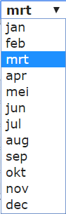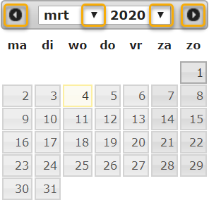 Een andere maand of een ander jaartal in beeld brengen kan via de de afrollijsten boven de kalender. Klik daartoe op het pijltje rechts van het veld om de lijst te openen en klik op de maand/het jaartal naar keuze. De afrollijst wordt daarmee gesloten en de gekozen maand in beeld gebracht. Om de vorige/volgende maand in beeld te brengen klik je op de knoppen uiterst links/rechts in de selectiebalk.
