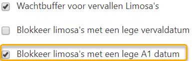 Vink de optie Blokkeer limosa's met een lege A1 datum aan en bevestig via een klik op de knop Opslaan bovenaan.