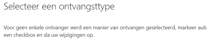 Voor elke geselecteerde ontvanger moet nu worden aangeduid of de meldingen per mail, par sms of via beide kanalen moeten worden verstuurd. Na de selectie van de ontvangers volgt een melding om je daar op te wijzen.