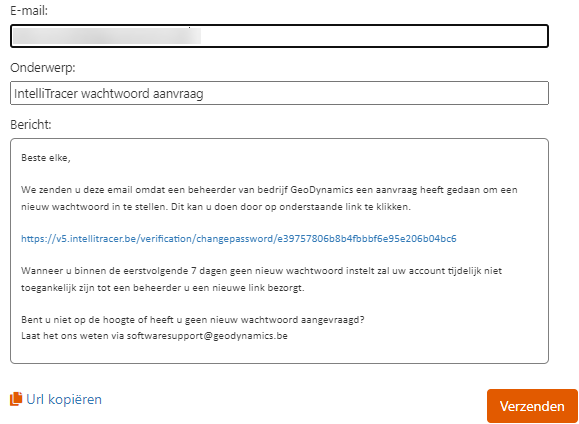Voorts verschijnt de mail die zal worden verstuurd naar het email-adres dat je op de bladzijde Eigenschappen hebt voorzien. Klik op Verzenden. De gebruiker zal via de link in de mail een eigen wachtwoord kunnen instellen en bevestigen.