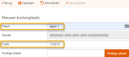 Klik bovenaan op de knop Toevoegen, benoem de kostenplaats in het veld Naam en noteer de code in het gelijknamige veld.