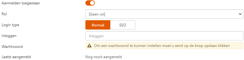 Het veld Wachtwoord vermeldt de tekst: Om een wachtwoord te kunnen instellen moet u eerst op de knop Opslaan klikken.