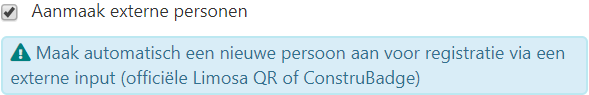 Vink de optie Aanmaak externe personen aan. Klik vervolgens bovenaan op de knop Opslaan.