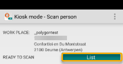 Bij het openen van de app wordt de gekoppelde werf vermeld en kan de persoonlijke qr-code van de persoon worden gescand, óf de gewenste perso(o)n(en) uit de lijst geselecteerd. Klik op de knop List om de lijst van geconfigureerde actieve personen te openen.