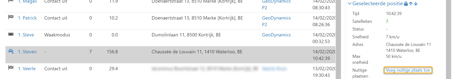 Klik de rij aan van het voertuig dat zich op de gewenste locatie bevindt, zodat de details verschijnen in het detailvenster rechts.
