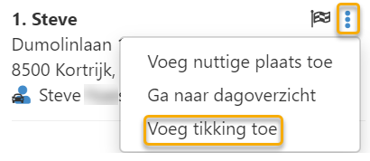 Links worden de voertuigen opgelijst met rechts van de naam het o zo interessante snelmenu! In dat snelmenu kies je voor Voeg tikking toe.