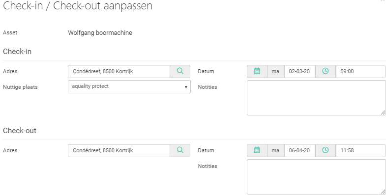 waarmee de locatie en tijdstip van de check in en check out kan worden aangepast.