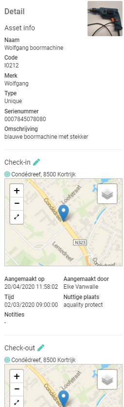 Kies je voor View, dan wordt rechts een detailvenster geopend met tal van informatievelden ivm de asset (sectie Asset info), tijdstip en locatie van de check in (sectie Check-in) en tijdstip en locatie van de check out (sectie Check out).