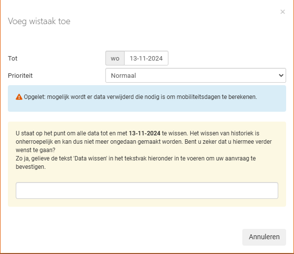 - Lees aandachtig de kader en vul indien nodig nog de tekst in die in de beschrijving staat vermeld ter bevestiging dat u de historiek wenst te wissen.