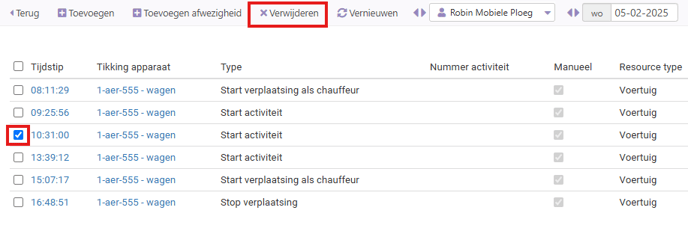 - Vink de gewenste tikking(en) aan en klik bovenaan op Verwijderen.
