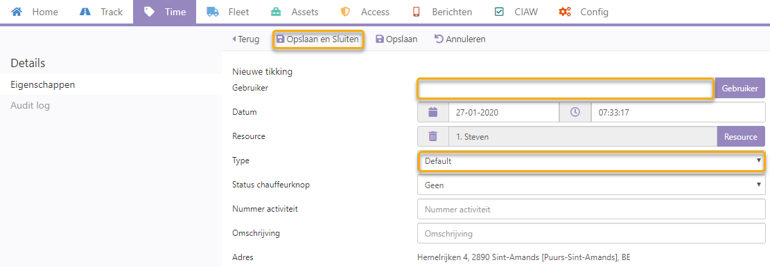 In het scherm dat verschijnt zie je dat het voertuig en het exacte tijdstip (alsook de locatie vanzelfsprekend) reeds gekend zijn, enkel de gebruiker moet nog door jou worden toegevoegd.