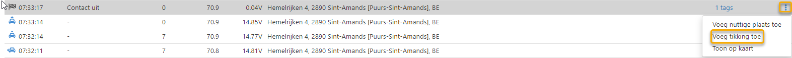 Via het overzicht per gebruiker/resource per dag/maand (zie Hoe voeg ik een tikking toe vanuit het overzicht per gebruiker/resource per dag/maand?) werken is handig om onregelmatigheden snel op te merken. Maar het dagoverzicht kan hiervoor ook worden gebruikt, omdat je hier over alle details beschikt van het voertuig. Tikkingen toevoegen vanuit het dagoverzicht is ten zeerste aan te raden wanneer de chauffeurbepaling gebeurt op basis van de volgorde van de tikkingen.