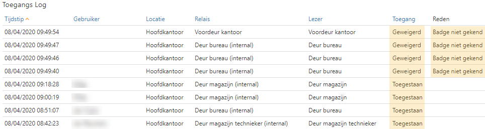 De toegangslog zal het overzicht opladen van de gebruikers die toegang hebben verkregen, maar ook van zij die zich geen toegang hebben kunnen verschaffen. Van deze laatste groep wordt ook de reden vermeld waarom toegang werd geweigerd