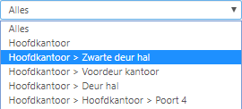 - Vooreerst is het mogelijk de keuze te maken tussen een welbepaalde locatie (met alle gekoppelde deuren/poorten en relais), een specifieke deur/poort of een specifieke relais. Standaard staat Alles ingesteld, dus standaard wordt de toegangslog van alle geconfigureerde locaties met gekoppelde deuren/poorten en relais opgeladen. Mbv de knop vorige
