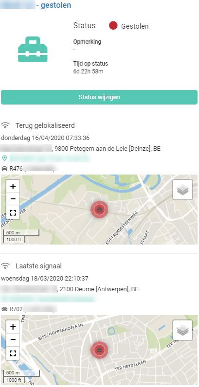 Daaronder staan dezelfde informatievelden nogmaals vermeld, maar van het laatste signaal dat werd opgevangen vóór de statuswijziging in Gestolen of Ontbrekend.