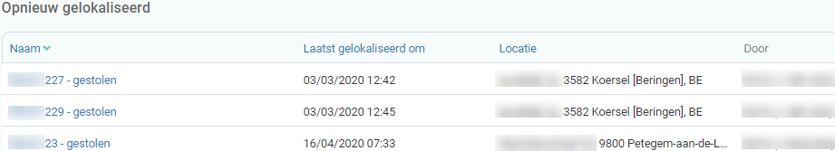 In het module Opnieuw gelokaliseerd worden de assets opgelijst waarvan nog een signaal is opgevangen nadat de status Gestolen of Ontbrekend werd toegekend.