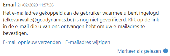 Bij het aanmaken van een login moet een email-adres worden ingegeven. Dit email-adres moet echter nog worden geverifieerd. In de praktijk betekent dit dat je na aanmelden in Intellitracer volgende melding zal krijgen: