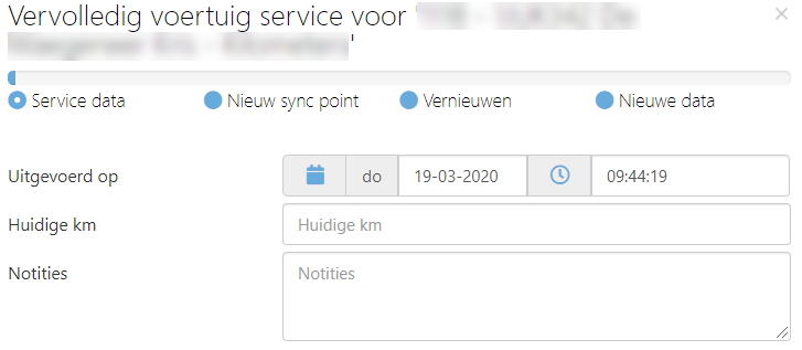 Klik op de knop Voertuigservice vervolledigen zodat de wizard wordt geopend die je helpt bij de update van de informatie. Dezelfde wizard kan je ook openen via een klik op Markeer als voldaan, te vinden bovenaan in het venster.