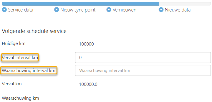 Concreet komt het erop neer dat voor een service op basis van de kilometers de velden Verval interval km en Waarschuwing interval km moeten worden ingevuld. Klik na de ingave op de knop Volgende en eindig met een klik op de knop Voltooien.