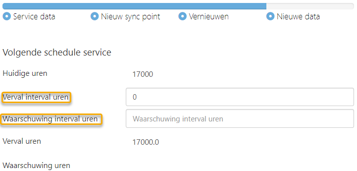 Concreet komt het erop neer dat voor een service op basis van de kilometers de velden Verval interval uren en Waarschuwing interval uren moeten worden ingevuld. Klik na de ingave op de knop Volgende en eindig met een klik op de knop Voltooien.