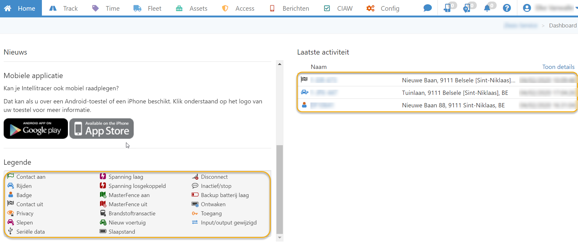 Rechts vind je de opsomming van de voertuigen/prikklokken waarop jij als gebruiker de rechten hebt, met de huidige positie.