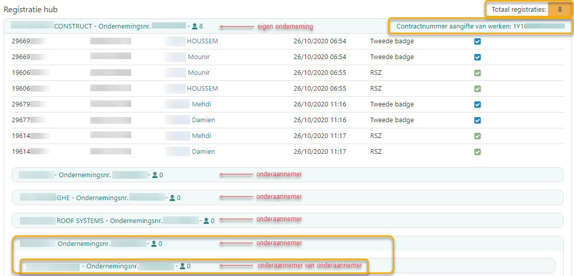 Aan de bovenzijde rechts krijg je te zien hoeveel registraties in totaal zijn gebeurd voor deze werf - weliswaar door personen die in jouw onderneming werkzaam zijn, of bij een onderaannemer.