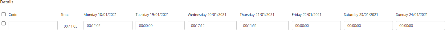 - Het selectievak is enkel actief indien er reeds werktijd is toegewezen aan een kostenplaats. Selecteer hier één of meerdere weekdagen alvorens bovenaan op de knop Nieuwe lijn te klikken. De werktijd die nog niet aan een kostenplaats is toegewezen, is aldus reeds ingevuld op deze datum/data. Zo kan deze heel vlot aan een kostenplaats worden toegewezen.