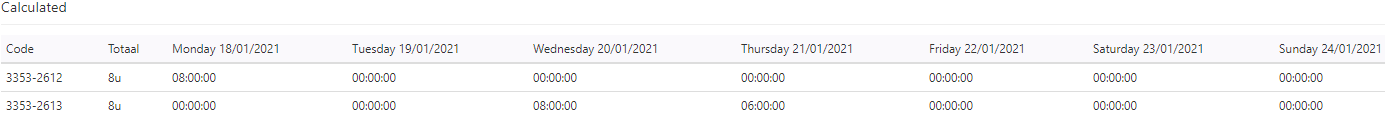 - Vervolgens wordt voor alle data binnen de geselecteerde termijn de met deze kostenplaats gekoppelde werktijd vermeld.