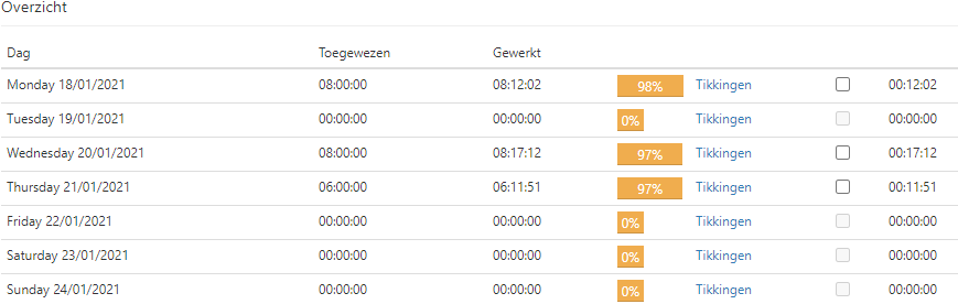 - In de kolom Gewerkt wordt de werktijd (hh:mm:ss) vermeld.